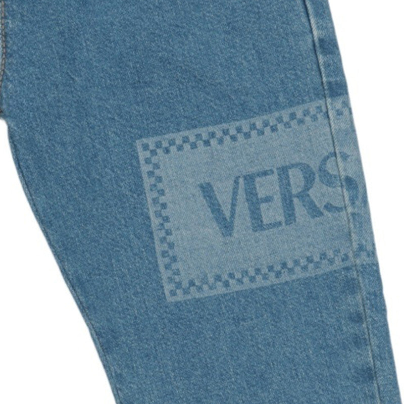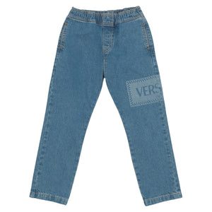 Blue Denim Jeans featuring a lasered '9s Vintage Logo motif on the side and a comfortable elastic waistband.