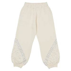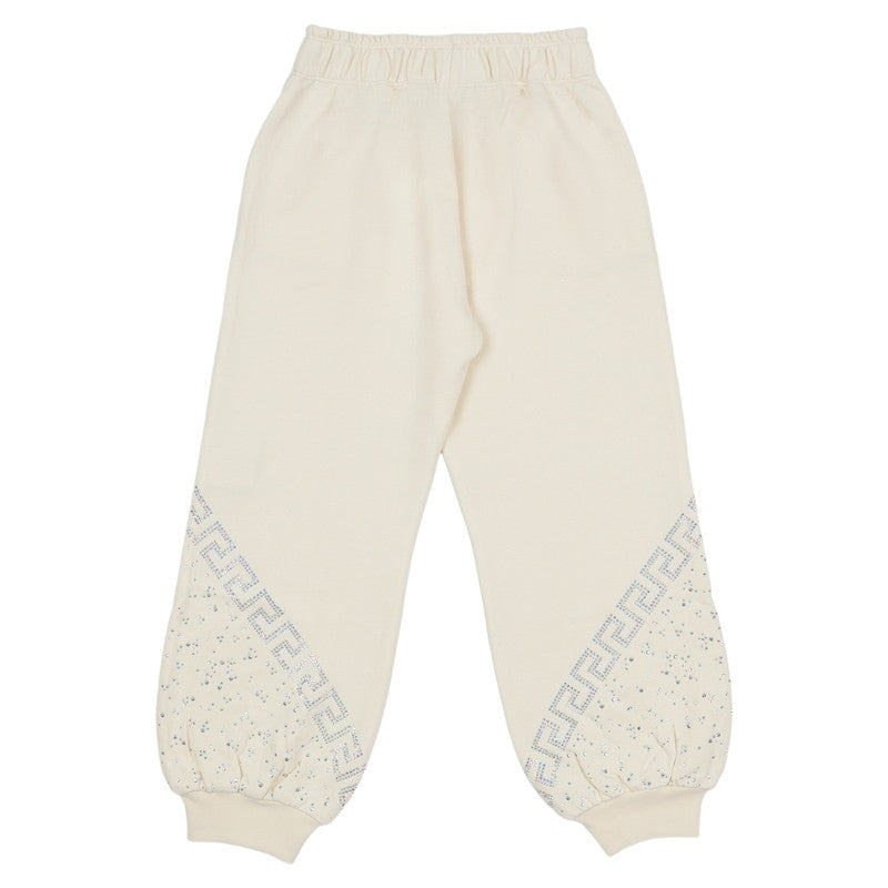 These elegant cream fleece sweatpants are elevated with sparkling designer details. They feature a cozy, comfortable fit and an elasticated waist and cuffs. The lower legs are adorned with shimmering silver rhinestones forming a Greca pattern border, mixing casual comfort with high-fashion flair.
