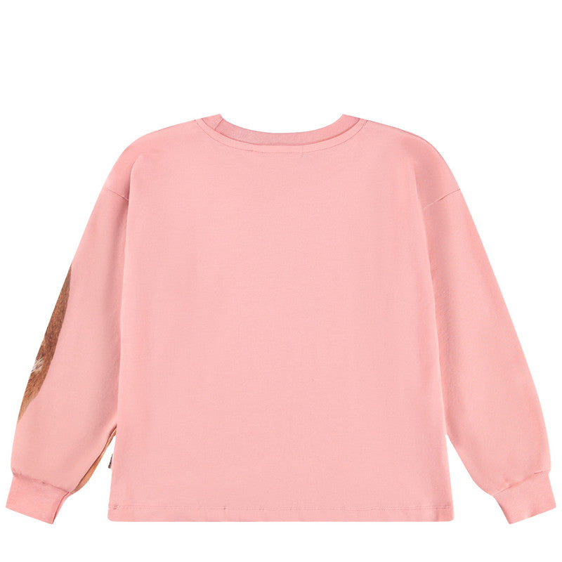 Pink long-sleeved top made of soft organic cotton with ribbed cuffs and neckline. The long-sleeved top has a loose fit and is longer at the back. The long-sleeved top has a print of a deer and a small bird meeting each other.