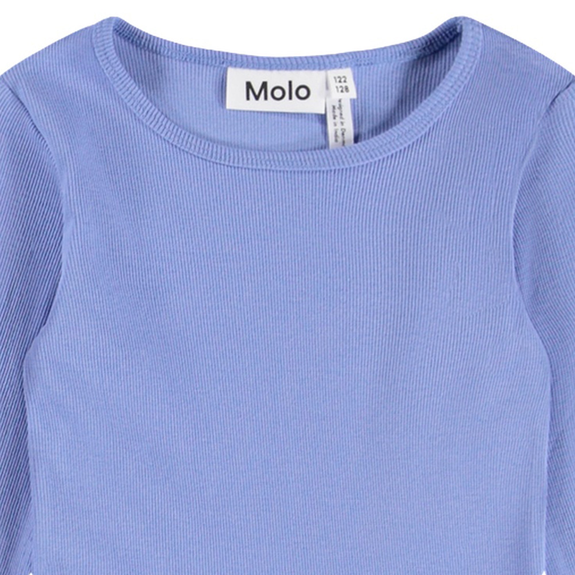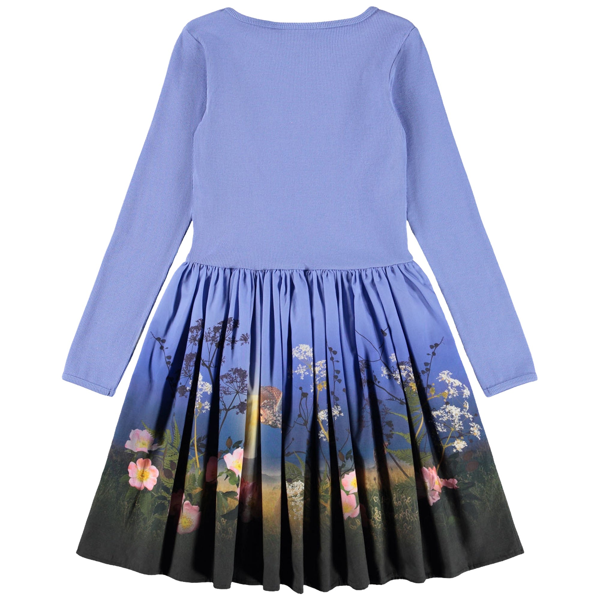 Lovely long-sleeved lavender blue dress by Molo, made in soft organic cotton. The jersey bodice is ribbed, with a simple round neckline. The poplin skirt is full and flared, and features an enchanting night-time, Autumnal scene with a serene moon, pretty flowers and cute animals.
