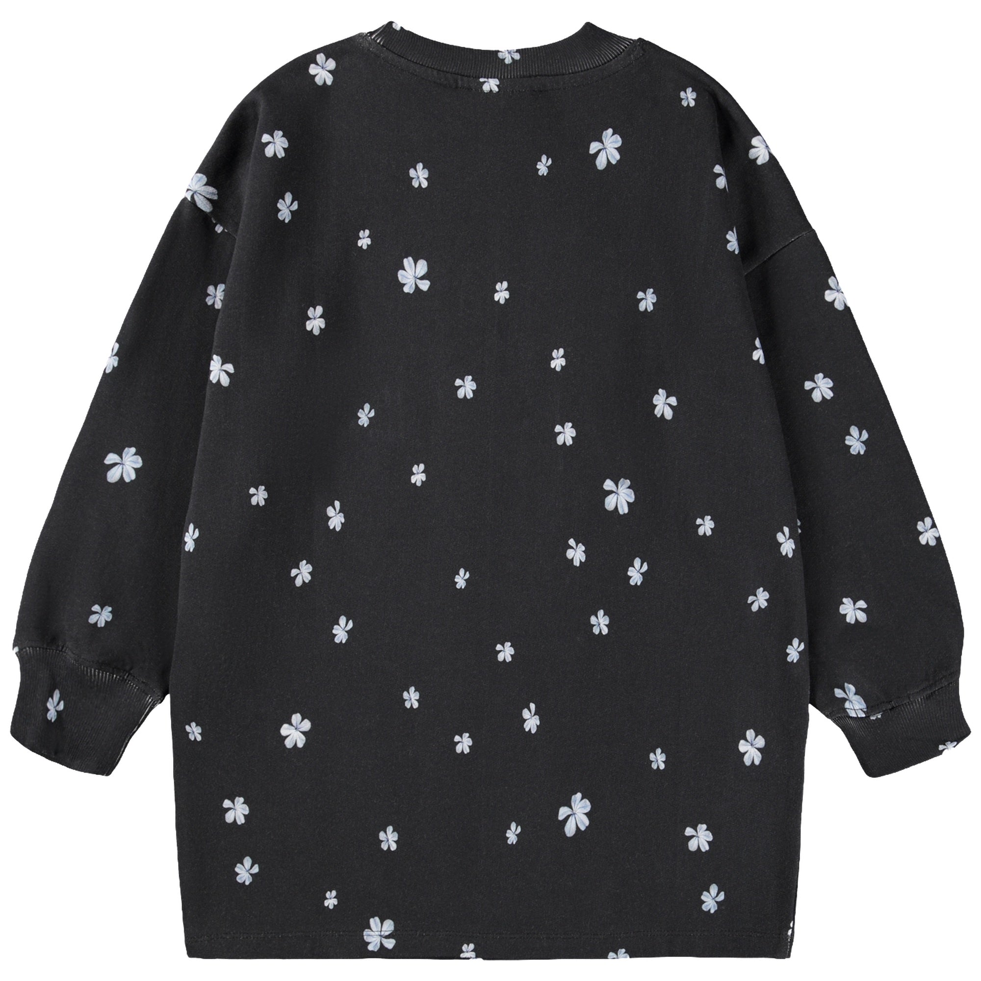 A striking black sweatshirt dress. It features a beautiful photographic unicorn print wrapped in a vibrant floral garland, set against a backdrop of scattered white flowers.