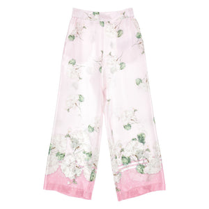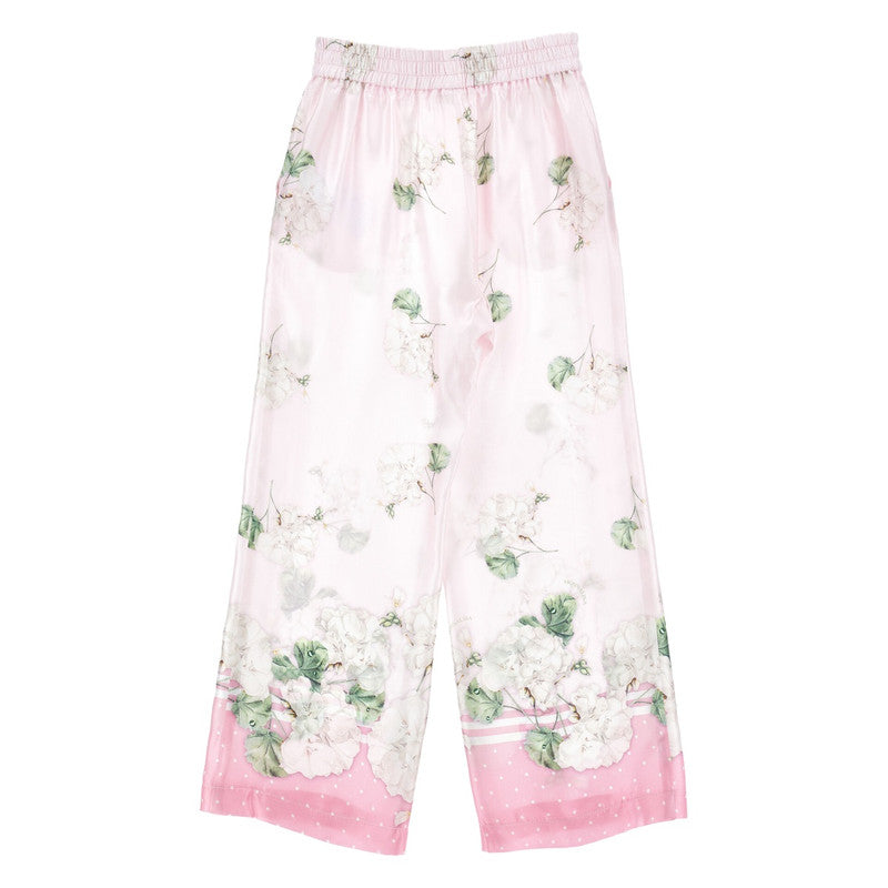 These Pale Pink Trousers For Girls By Monnalisa Exude Elegance And Charm, With A Delightful Green And White Floral Pattern. Made In Lustrous Viscose Satin, These Wide-Leg Trousers Have A Gently Elasticated Waist For Comfort And Slanted Front Pockets.