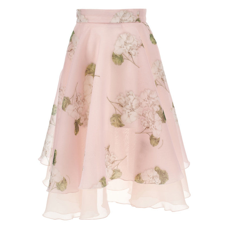 It Features A Pink Color, A Floral Print, A Ruffled Hem, A Logo Plaque, A Layered Design, And A Belt.