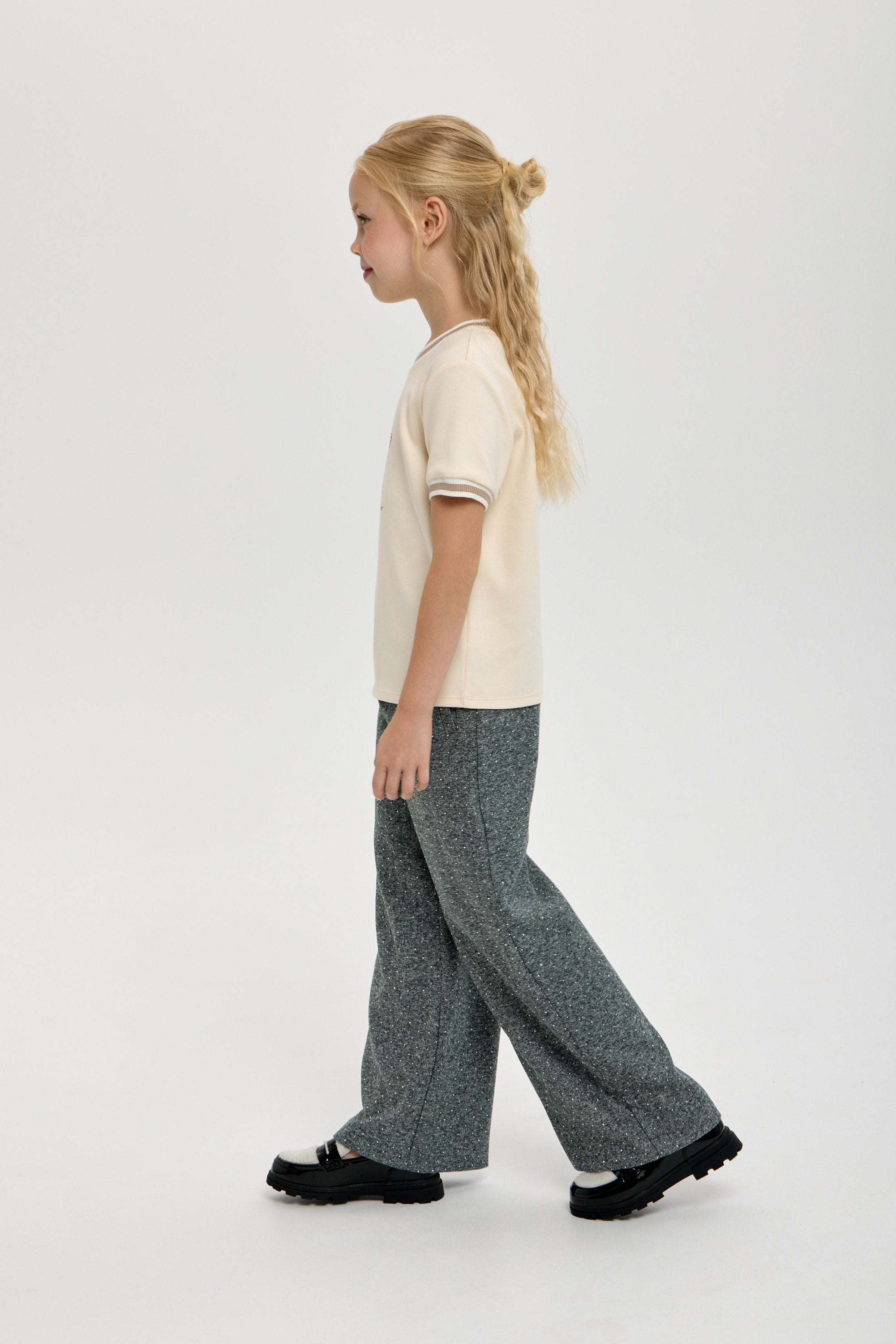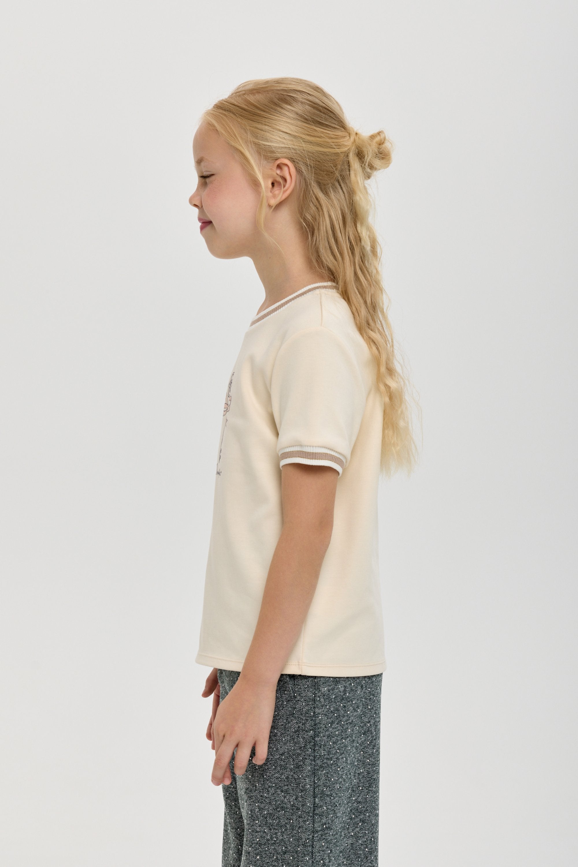 This elegant T-shirt features a stylish print designed specifically for girls who appreciate refined fashion. Crafted to combine comfort with a chic look, it complements both casual and semi-formal wardrobes effortlessly. Its subtle yet eye-catching design makes it a versatile addition for a sophisticated style statement.