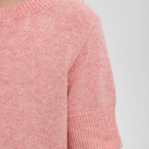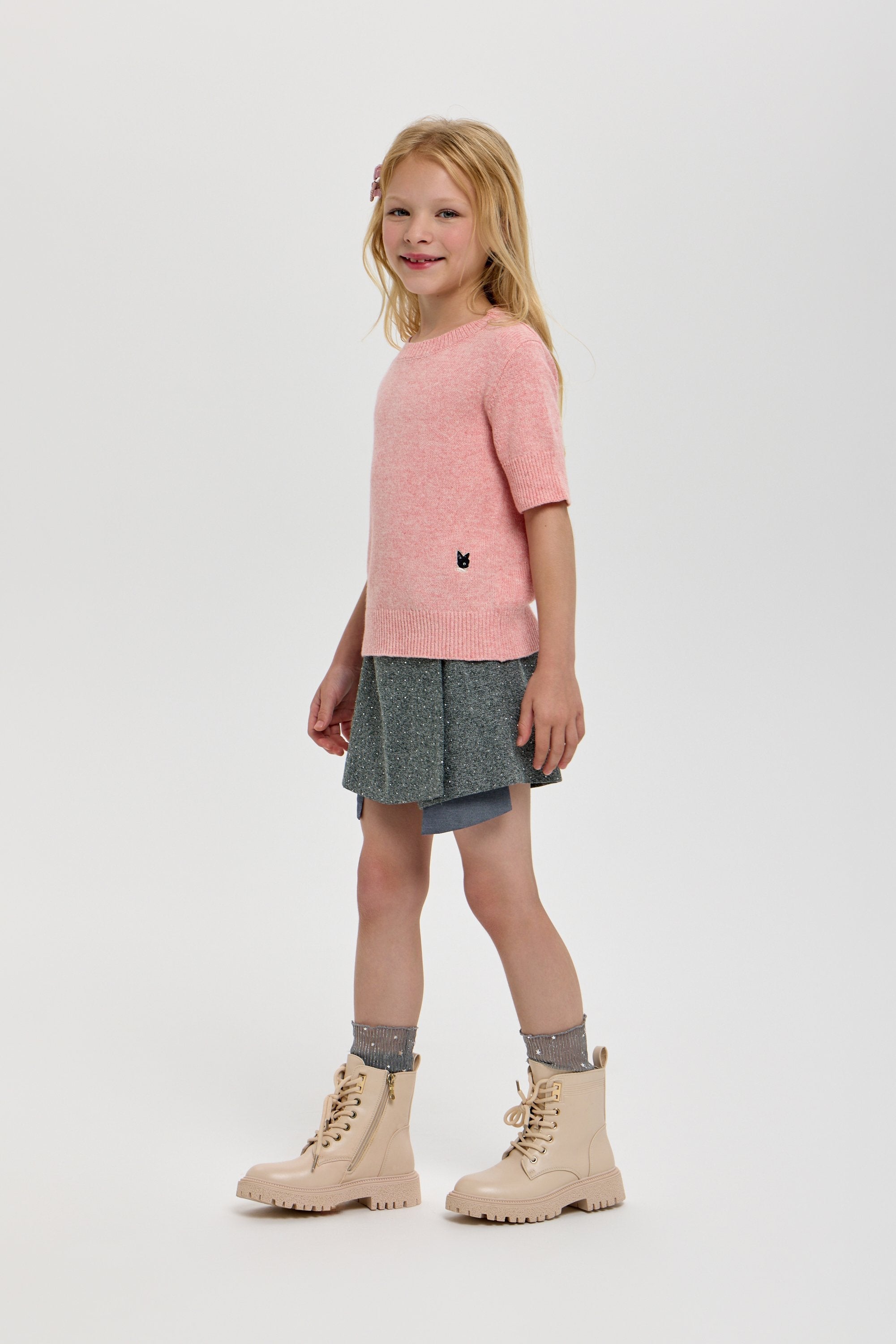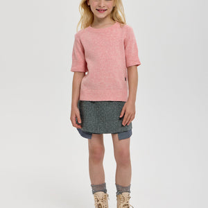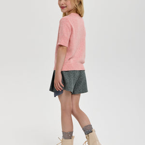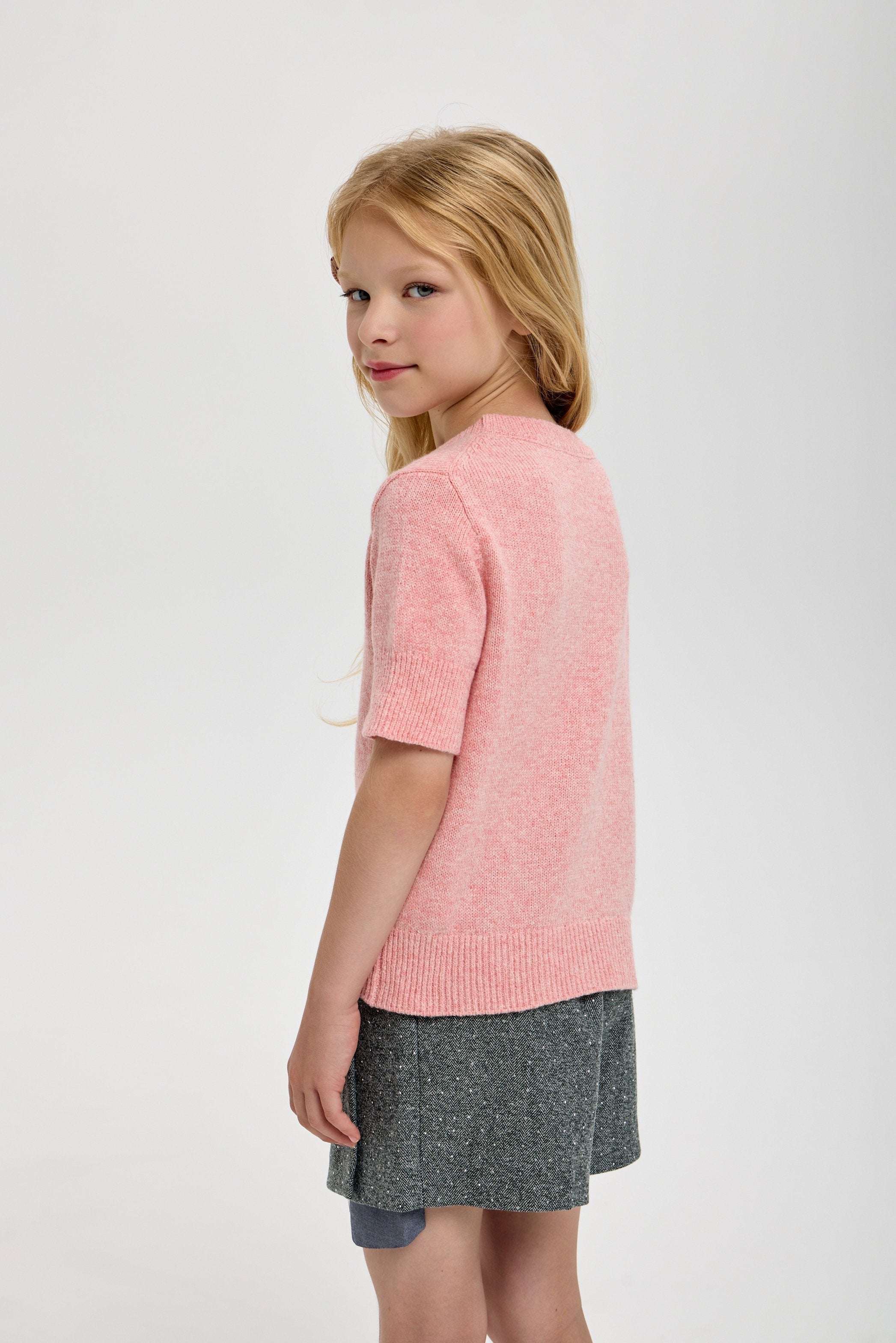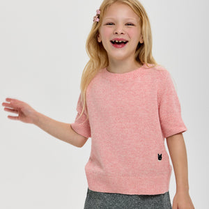 This peach-colored knitted sweatshirt for girls combines a soft, breathable fabric with a short sleeve design for comfort and style. Its refined texture and elegant hue make it a versatile choice for casual or semi-formal occasions, ensuring both warmth and ease of movement.