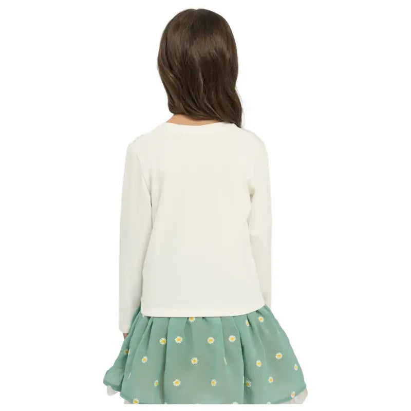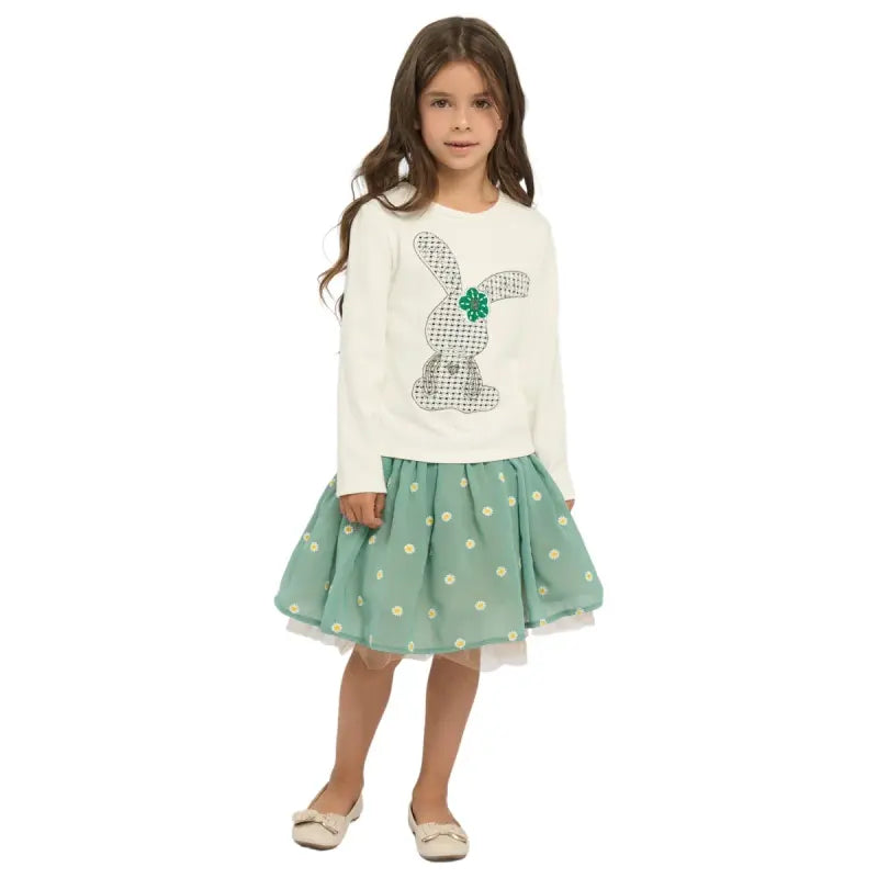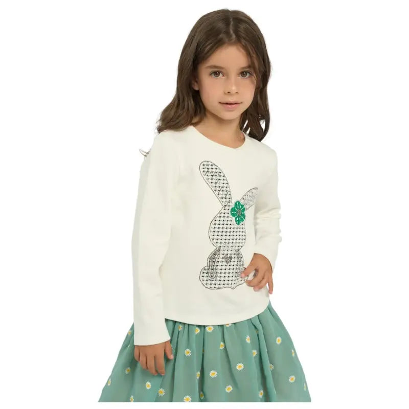 The long-sleeve top for girls is made from white jersey fabric. The textured bunny decoration with a green flower adds a playful accent to the model, drawing attention and making the outfit memorable. This piece is perfect for both everyday wear and festive occasions. The comfortable straight silhouette allows for free movement, which is essential for active children. The cotton-based fabric ensures comfort throughout the day.