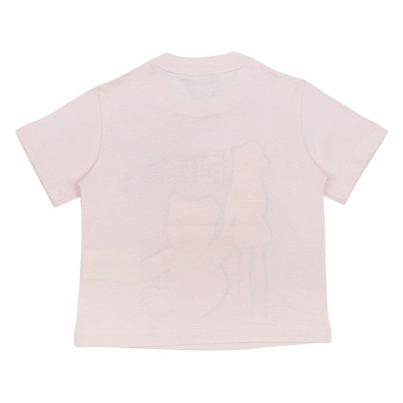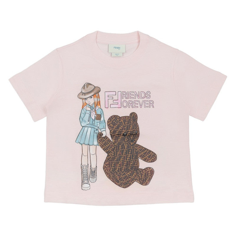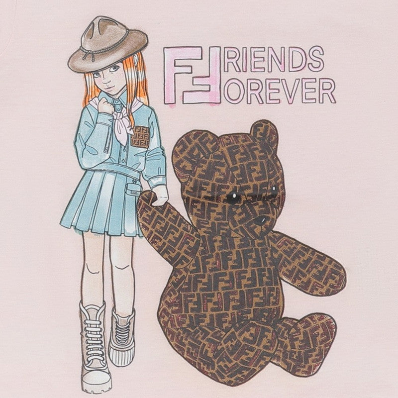 Pale pink cotton T-shirt featuring a FF 'Friends Forever' slogan on the front, with a shy-looking girl scout holding hands with the brand's iconic Fendi bear.