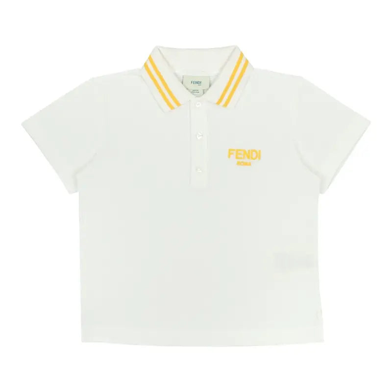 White cotton Pique junior polo shirt with collar details and yellow embroidery on the front.