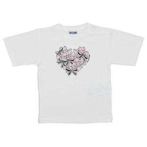 This Charming Moschino T-Shirt In Ivory Features A Playful Graphic Of Pink And Black Bows Arranged In A Heart Shape. A Sweet And Stylish Cotton Top For Kids.
