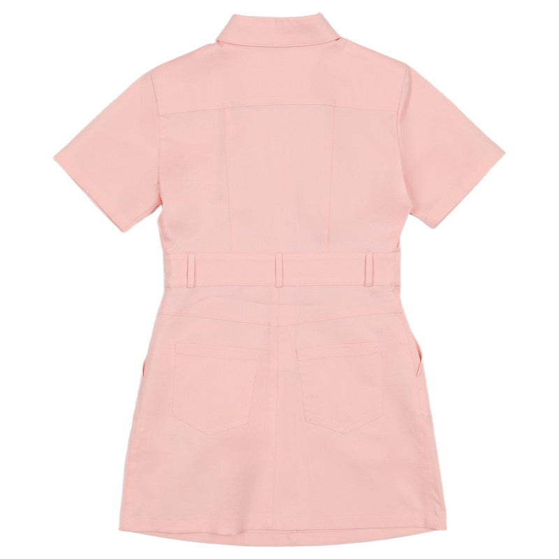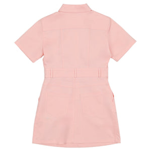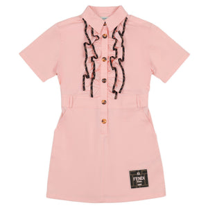 This pink cotton twill shirt dress for girls by Fendi elevates a classic silhouette with the luxury Italian label's signature detailing. This short-sleeved style is trimmed with ruffles on the front, edged with the brand's iconic brown FF logo and secured with branded, tortoiseshell-style buttons.