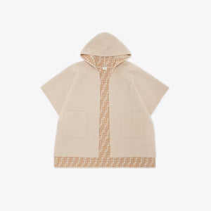 An elegant Fendi cashmere-blend hooded cape offering two looks: solid beige with logo trim or a bold, all-over tan FF monogram print.