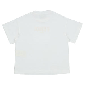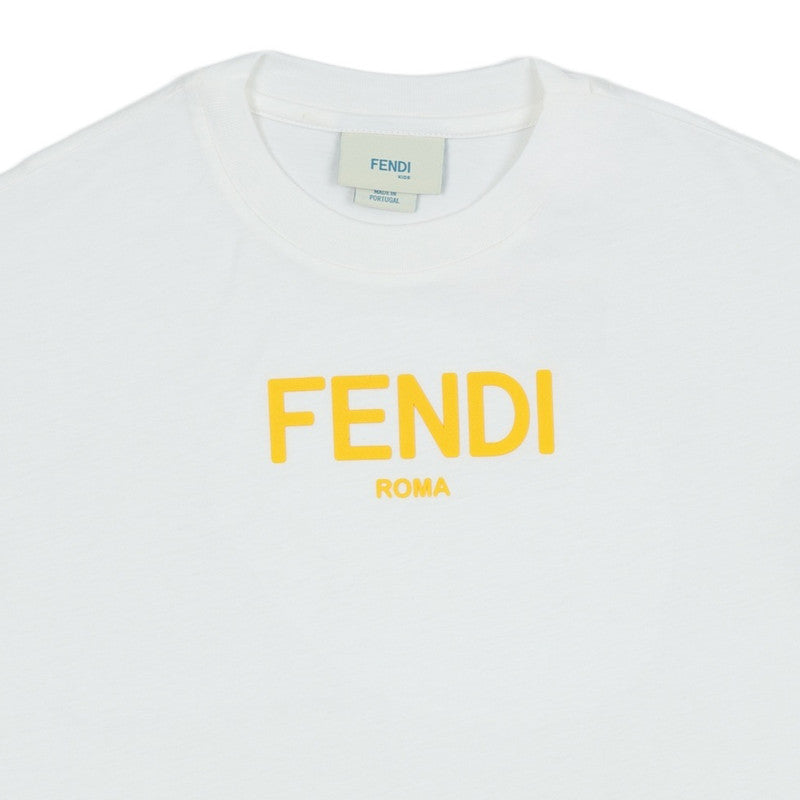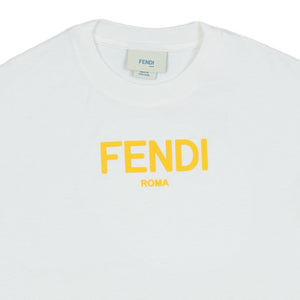 Classic white t-shirt featuring a comfortable, oversized fit and a striking Fendi Roma logo printed brightly in yellow on the chest.