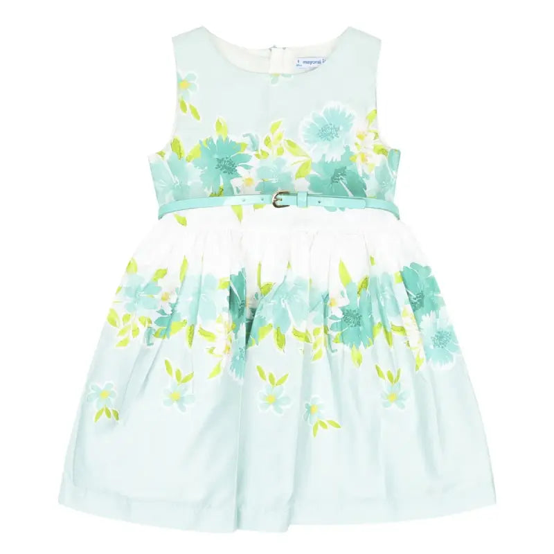 A pretty mint green and white dress for girls by Spanish brand Mayoral, woven in cotton for a soft and gentle feel. This sleeveless style is patterned with blossoming green and yellow flowers for a charming look. It has a detachable belt on the waistline, with an adjustable gold pin buckle. The dress is fully lined and fastens on the back with a zip.