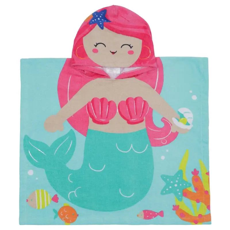 This baby beach towel features a cheerful mermaid with sunglasses on a bright blue background. Soft, absorbent, and generously sized for beach or pool fun.