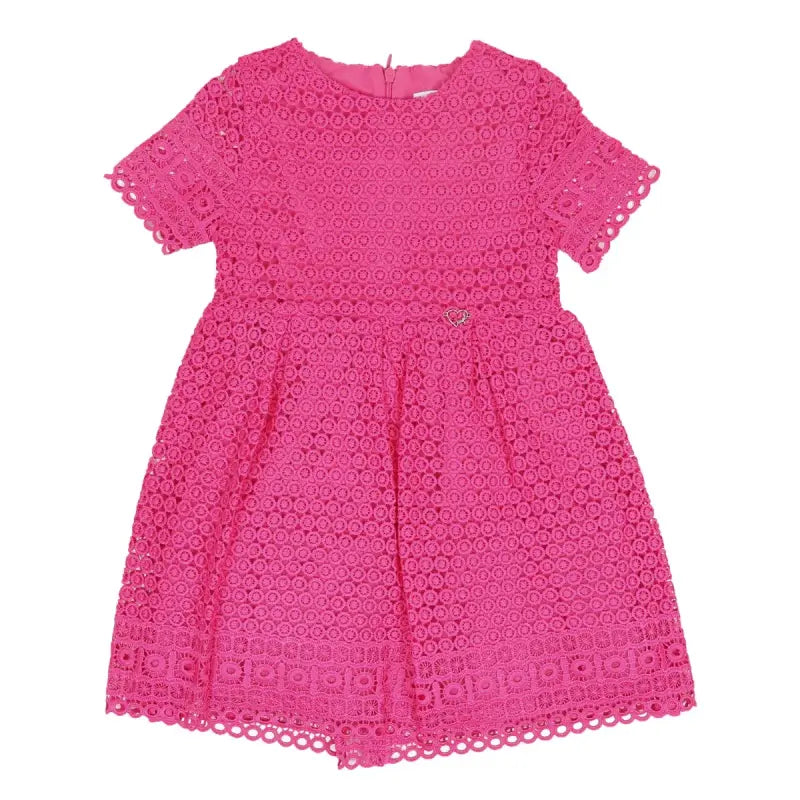 A stunning fuchsia pink dress for girls by Mayoral, made in beautiful guipure lace. Lovely for special occasion wear, it has short, sheer sleeves, a gathered waist and a lightly pleated skirt with a silver heart-shaped charm logo on the waistline. It is lined in soft voile with a tulle frill for added volume and fastens with a discreet, concealed zip on the back.