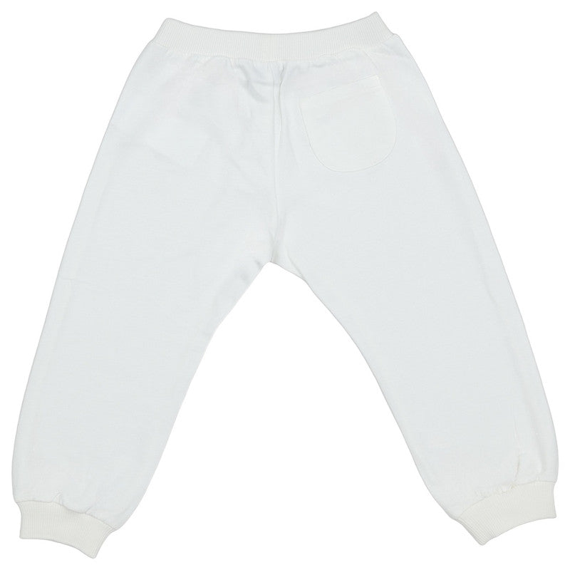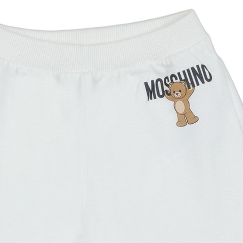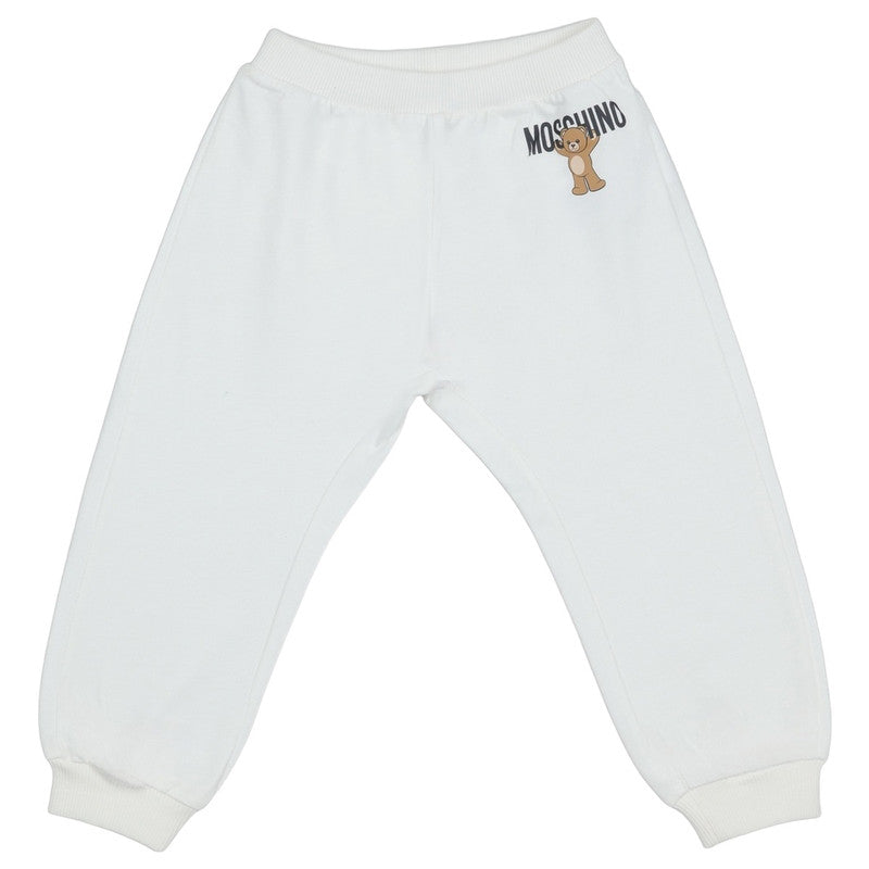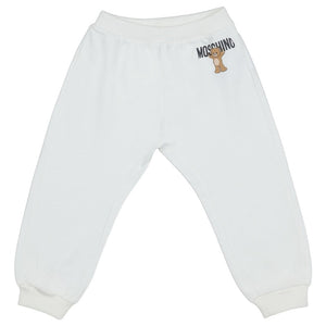 Ivory Joggers For Baby And Younger Boys And Girls By Luxury Italian Designer Moschino. Made From Soft Cotton. They Feature The Brands Iconic Teddy Bear And Logo Print On The Front, They Have Single Pocket At The Back And Finished With An Elasticated Waistband For Comfortable Fit.