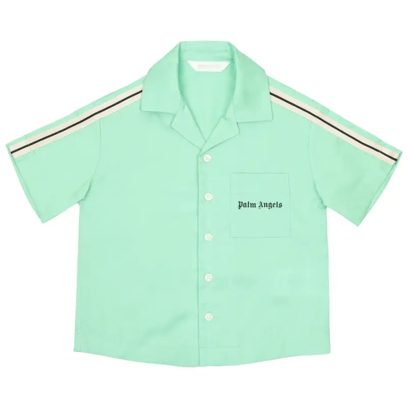 Inspired by bowling styles, this Palm Angels Kids shirt is characterised by its soft green hue and wide notched collar. It's printed with a small logo on the chest and finished with the label's seasonal track stripes, imparting a sporty edge to the design.