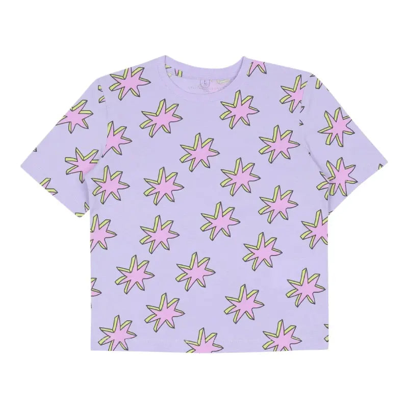 Lilac purple T-shirt for girls by Stella McCartney Kids, made in soft and stretchy organic cotton jersey. Cool and casual, this fun short-sleeved tee is patterned with pink and yellow stars and has a classic ribbed crew neck