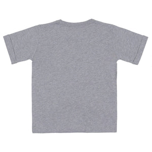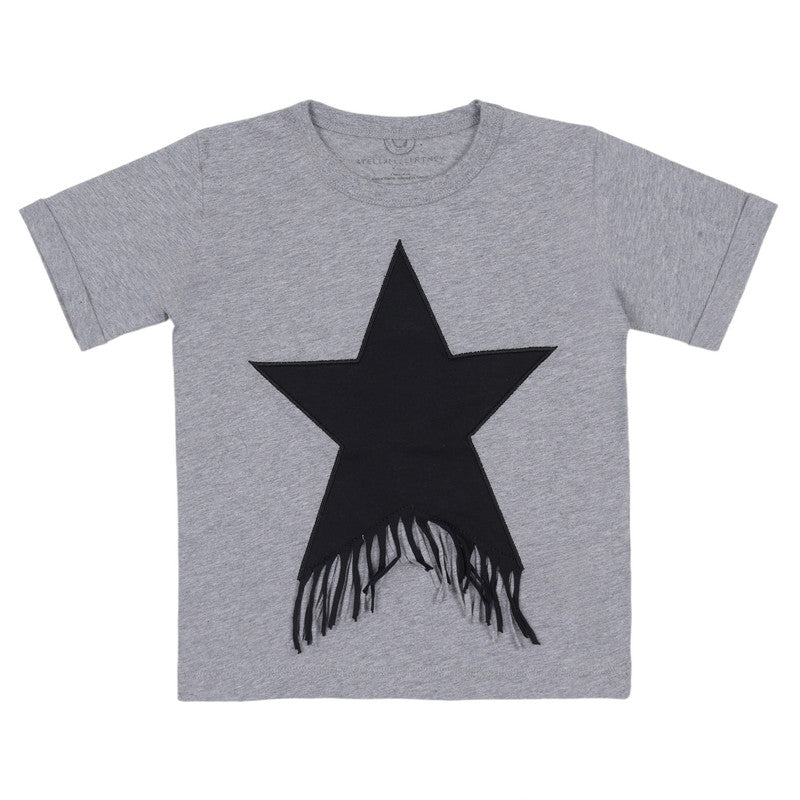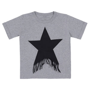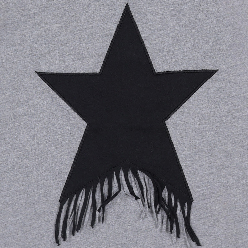 A grey marl t-shirt featuring a large black star appliqué with a frayed, fringe effect at the bottom for a unique and playful style.