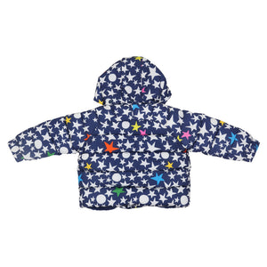 The Stella McCartney Kids girls' blue jacket with star motif is available on the RubinoKids.com online store. Made of 100% polyester, it features a blue color, a star motif, a quilted design, a hooded neck, a zip closure, and long sleeves