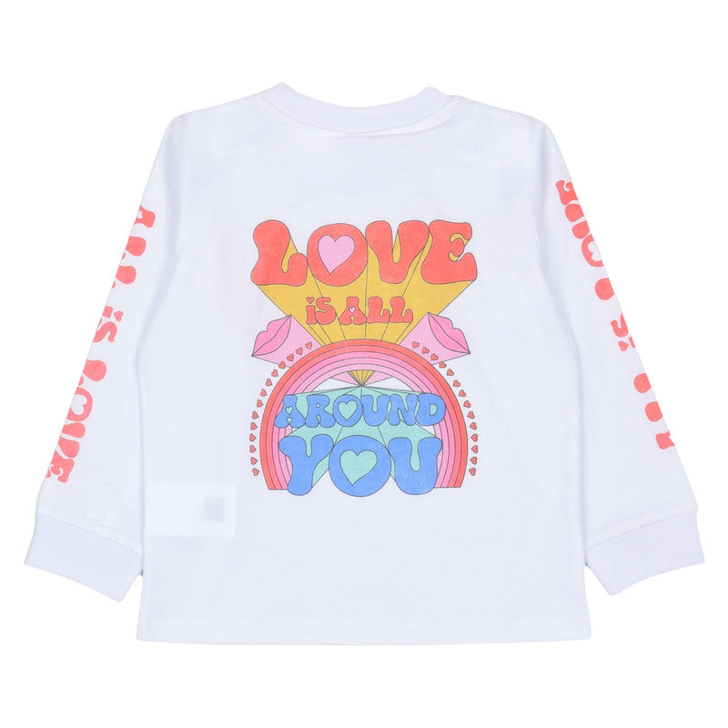 The Stella McCartney Kids white T-shirt for girls with heart print is available on the RubinoKids.com online store. Made of 100% fabric, it features a white heart print, long sleeves, a crew neck, and a graphic print.