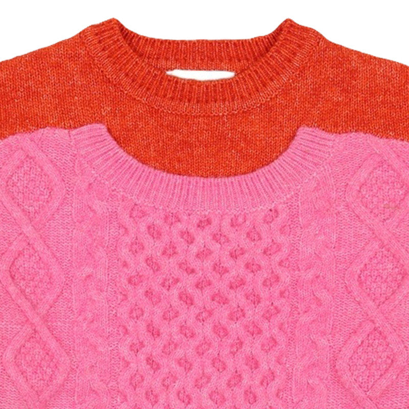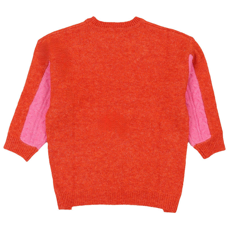 The Stella McCartney Kids multicolored color-block sweater for girls is available on the RubinoKids.com online store. Made of 97% polyester, 3% elastane, it features a pink/orange colorblock design, 3/4 sleeves, a crew neck, and a layered design effect.