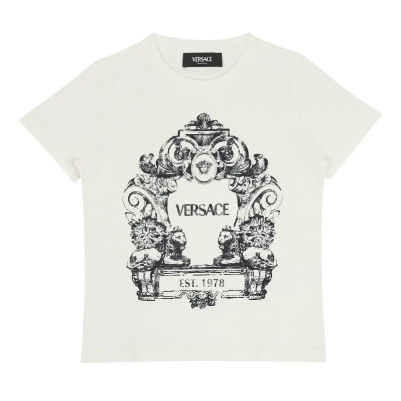 Inspired by the adult collection, this ivory Mini-me T-shirt for boys is designed by Versace. Made in soft cotton jersey, it has a signature Versace Cartouche printed on the front in navy blue for bold, branded impact. Casual and crew neck, it has short sleeves and is ideal for easy-to-wear pairings.