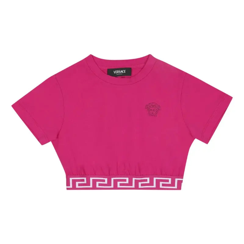 This cropped short-sleeved T-shirt feature an elastic Greca border and a small embroidered Medusa emblem at the chest.