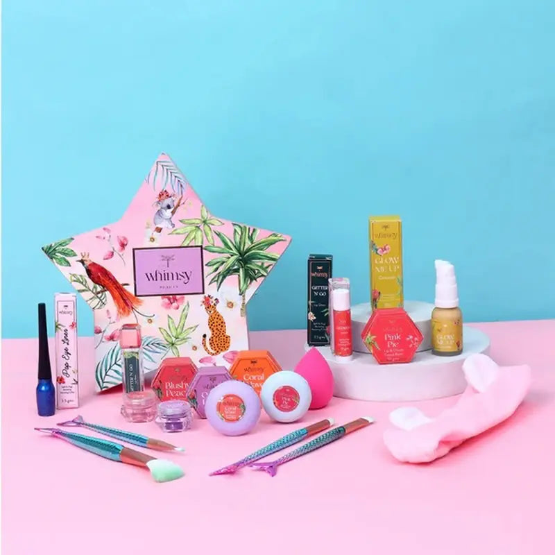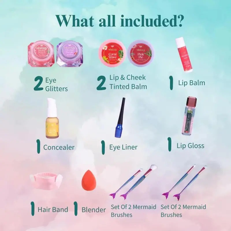 Whimsy Beauty Blossom Beauty Kit is an all-in-one makeup kit which includes 1 Concealer, 1 Lip Gloss, 2 Lip Cheek Tint, 2 Eye Glitter, 1 Eye Liner, 1 lip Balm, 1 Beauty Blender, 1 Makeup Hairband, 2 Small mermaid brushes, 2 Large Brushes.