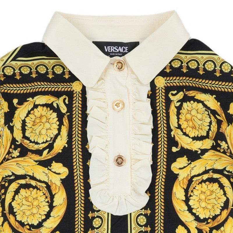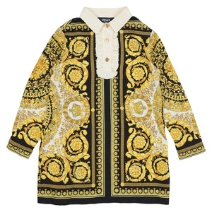 This stunning tunic dress features the iconic Versace Barocco print in rich gold, black, and white. It is elegantly styled with a crisp white Peter Pan collar and a beautiful central ruffled placket with refined button closures. A truly luxurious and unforgettable statement piece.