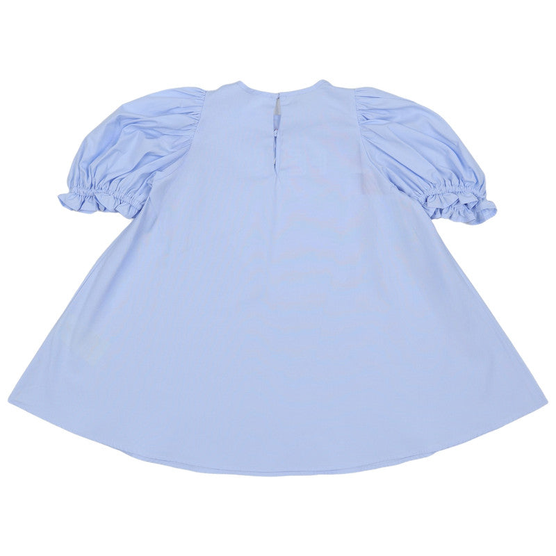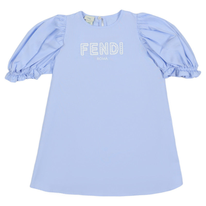 Lovely pale blue swing dress for girls by luxury designer Fendi, made in soft and cool cotton poplin. This elegant style has a white logo embroidery on the front and features pretty puffed sleeves with ruffled cuffs. It is comfortable and lightweight, with concealed button fastenings on the back.