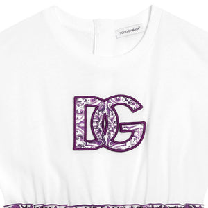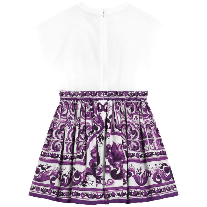 Cotton dress for girls by luxury Italian fashion label Dolce & Gabbana. Designed to look like a T-shirt and skirt, the white top is made in soft jersey, with a DG logo appliqué on the front. The poplin skirt features the designer's signature Majolica pattern in vibrant purple on a white background, matching the logo on the chest.