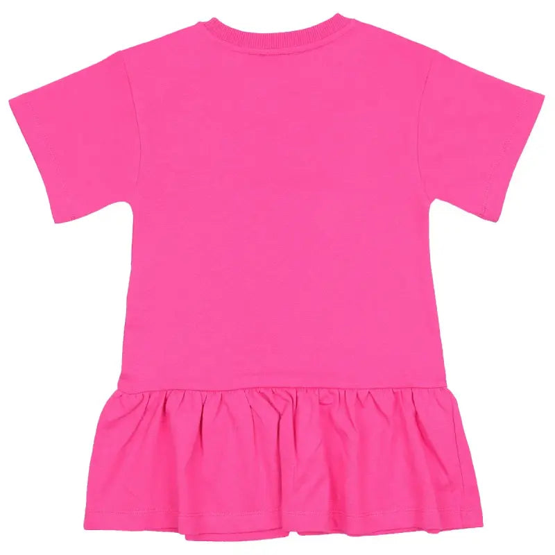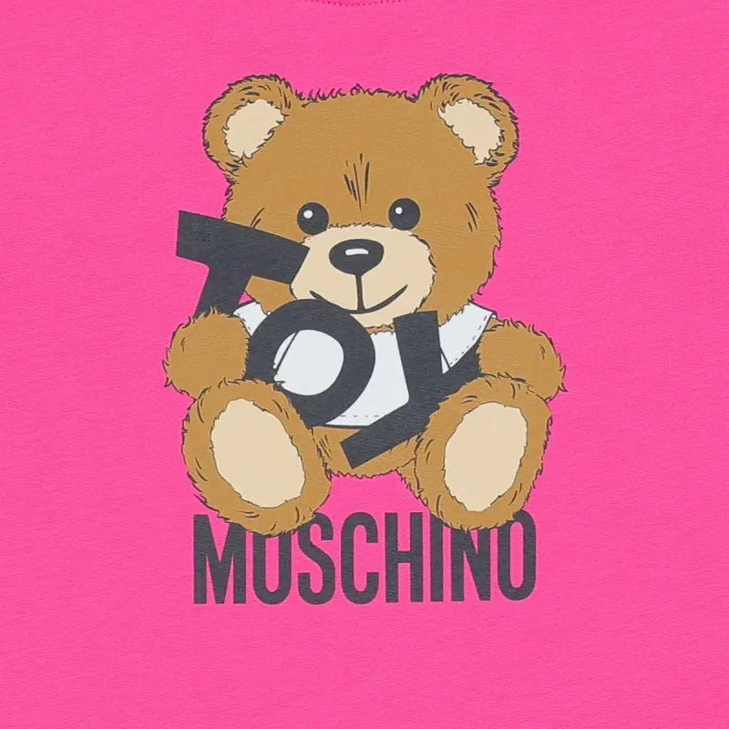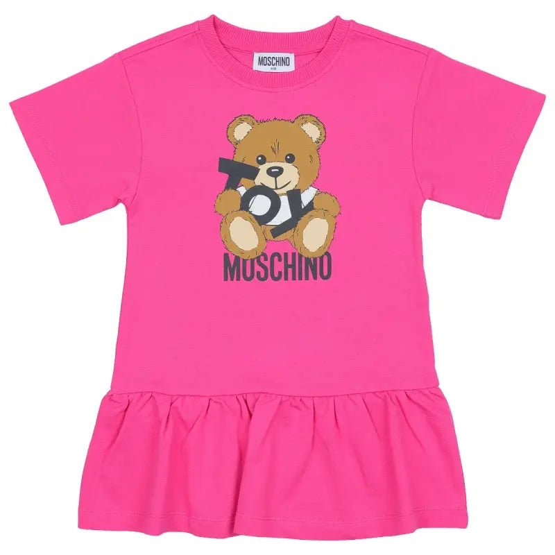 Pink dress by Moschino, printed with the instantly recognisable Moschino Teddy Bear on the front. Casual and easy to wear, it has a relaxed T-shirt style with a dropped hem.