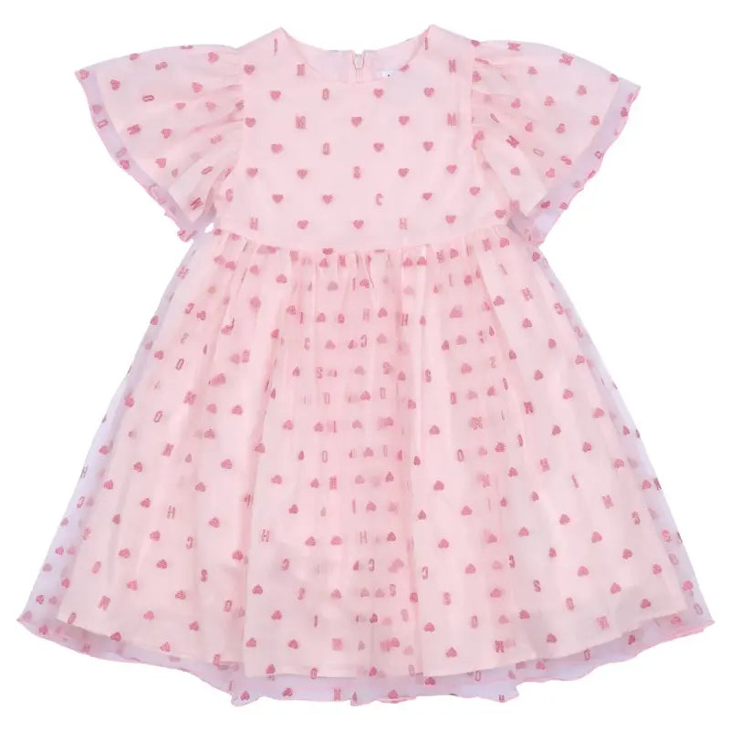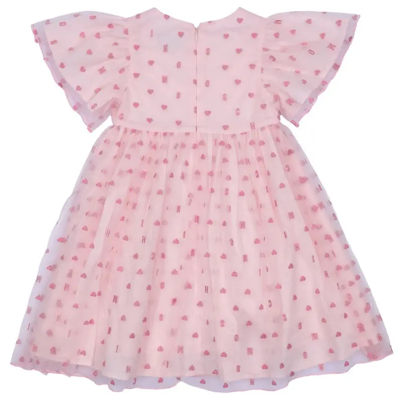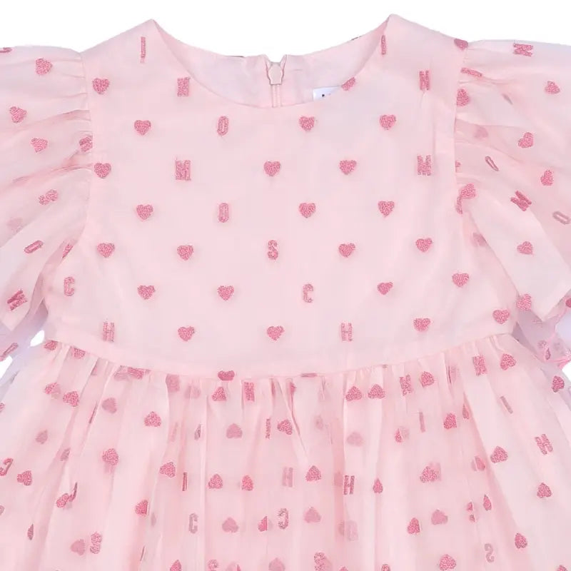 Fabulous pale pink party dress by Moschino, glittering with hearts and logo letters in contrasting pink. Ideal for any special occasion, it has a beautiful silhouette, with full, gathered sleeves and a coordinating skirt.