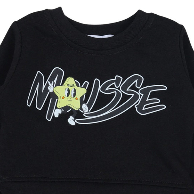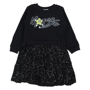 Let her shine in this black dress by Mousse, featuring a playful star character on the cozy jersey top and a dazzling, fully-sequined skirt for night-sky sparkle.