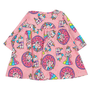 This playful Mousse pink dress features a comfortable, relaxed fit and a vibrant, all-over graphic print showcasing cheerful unicorns, colorful rainbows, and sweet donuts.