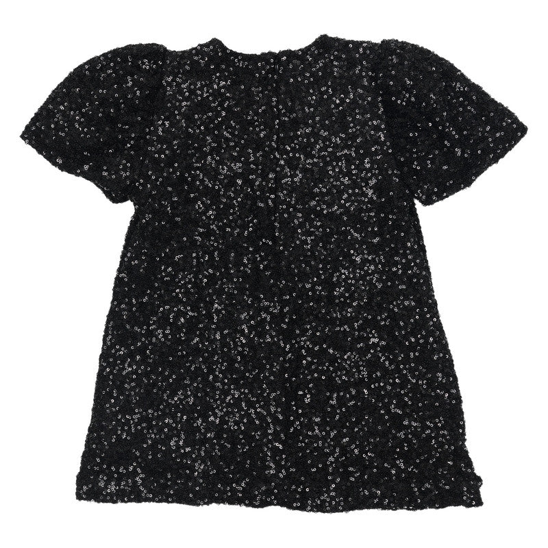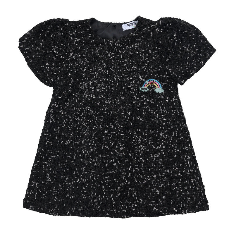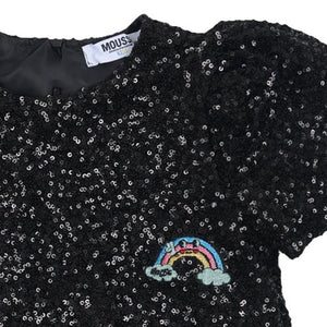 This glamorous Mousse black dress is entirely covered in dazzling sequins, featuring playful short sleeves and a charming embroidered rainbow patch on the chest.