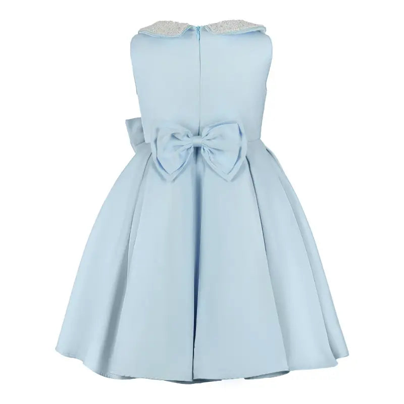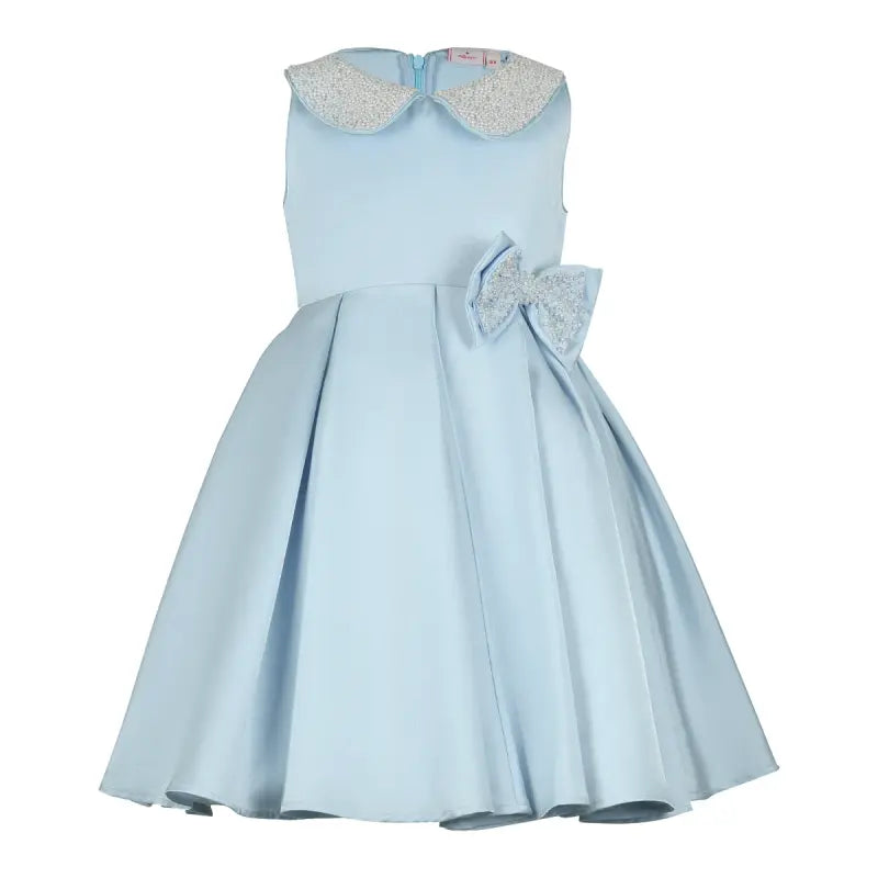 A charming Peter Pan collar dress for girls with pearl detailing on the collar and a bow on the waistline, ideal for evening occasions.