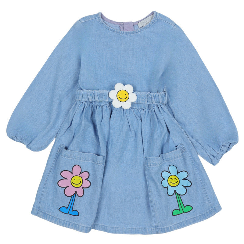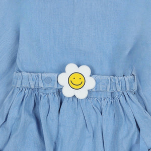 A charming light blue denim dress with balloon sleeves, two floral pockets, and a smiling daisy appliqué belt at the waist.