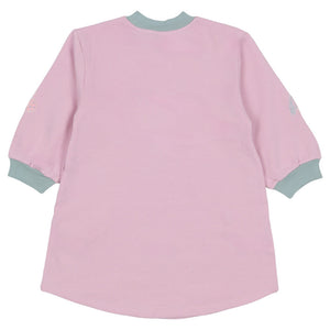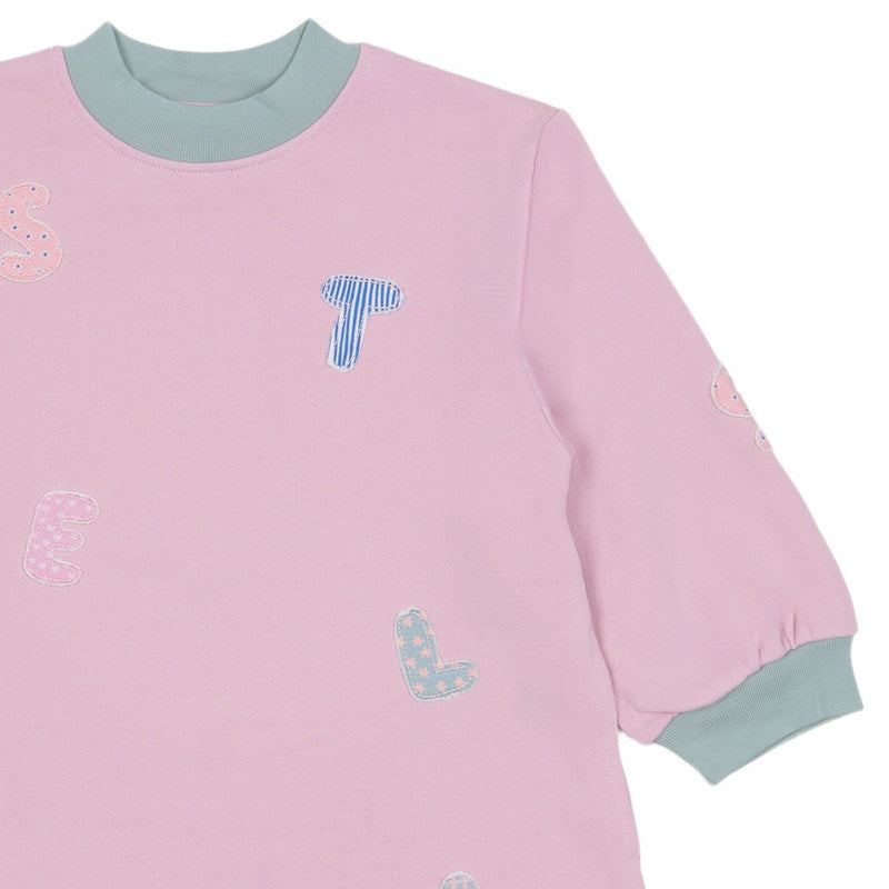 A soft pink long-sleeve sweater dress with contrasting green trim and colorful, stitched letter appliqués scattered across the front.