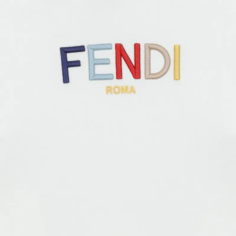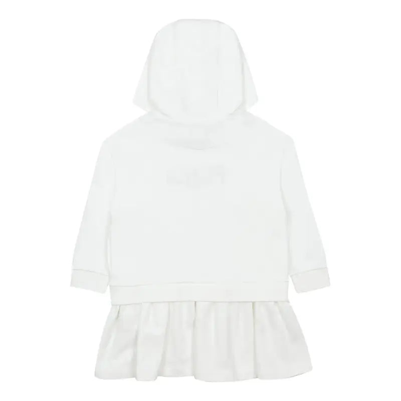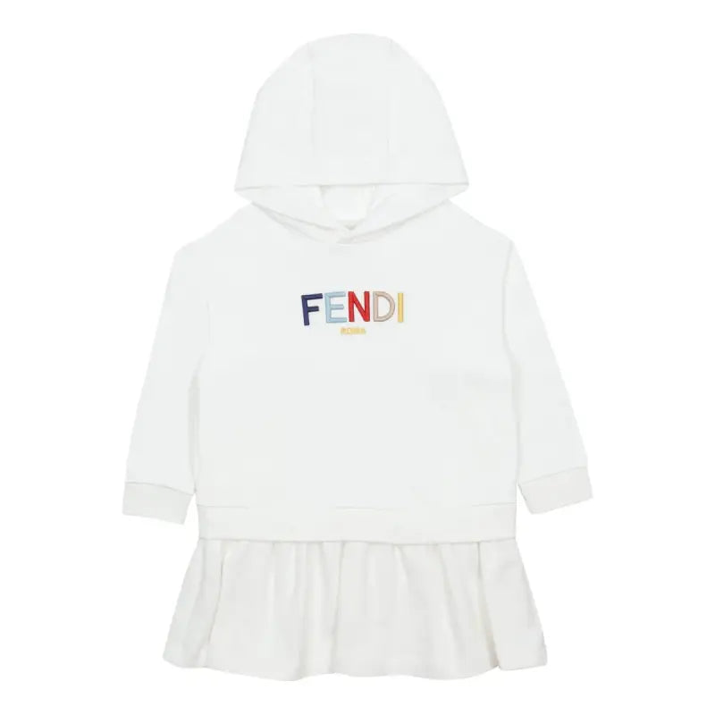 Lovely and casual, this off-white cotton sweatshirt dress is by luxury Italian brand, Fendi. It is made in soft, mid-weight jersey with a cosy hood. Designed in a layered look with a sweet ruffled hem, the colourful Fendi Roma logo embroidery on the front gives it an unmistakable luxury touch.