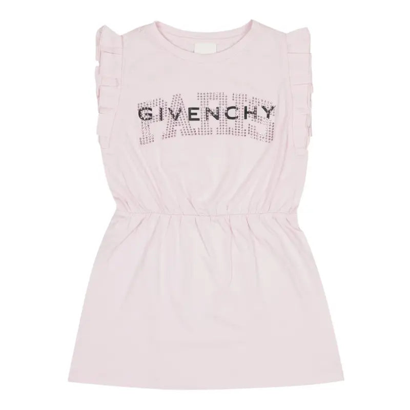 Eye-catching pale pink Mini-me cotton dress for girls by Givenchy, with a bold black logo printed across the front and glittering pink rhinestones. It is made in comfortable, lightweight jersey with feminine, pleats over the shoulders and a stretchy, elasticated waistband. Easy to wear, it simply pulls on over the head.