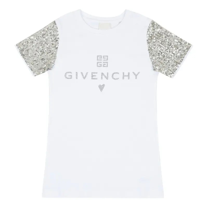 A white cotton T-shirt dress for girls with the wow factor by Givenchy. On the front, it has the brand logos, including the 4G motif and a heart, sparkling with silver Swarovski crystals and beads. For added glamour, the short sleeves shimmer with silver sequins. It is made in soft, comfortable jersey and is easy to wear, simply pulling on.