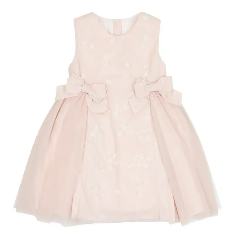 Ideal for special occasions, this pale pink sleeveless dress for girls is by Lapin House. Made from lightweight tulle with subtle silver sparkles, it is sprinkled with floral details stitched with tiny beads for an elegant look. There are two large bow embellishments on the front, decorated with faux pearls for added glamour. Lined in lightweight cotton, it fastens neatly with faux pearl buttons on the back.