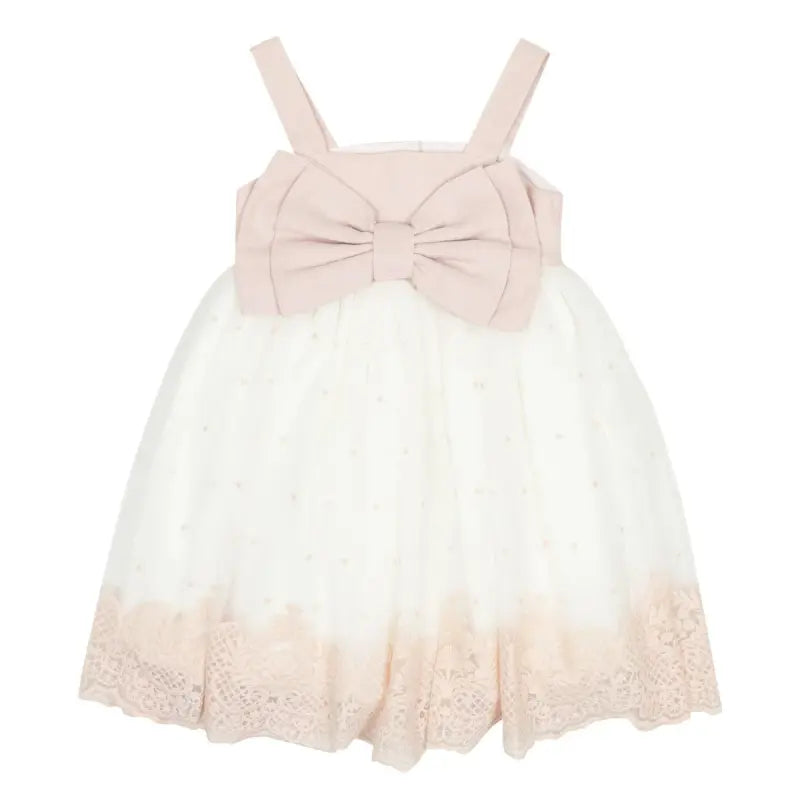 Utterly delightful, this pink and ivory sleeveless dress for girls is by Lapin House. The charming bodice is made from a smooth linen-blended weave and has narrow straps and a large bow embellishment on the chest. Ideal for special occasions, it has a voluminous dotted tulle skirt with an embroidered pale pink scalloped hemline in an ornamental design. Lined in lightweight cotton, it fastens with diamanté buttons on the back for an elegant finish.