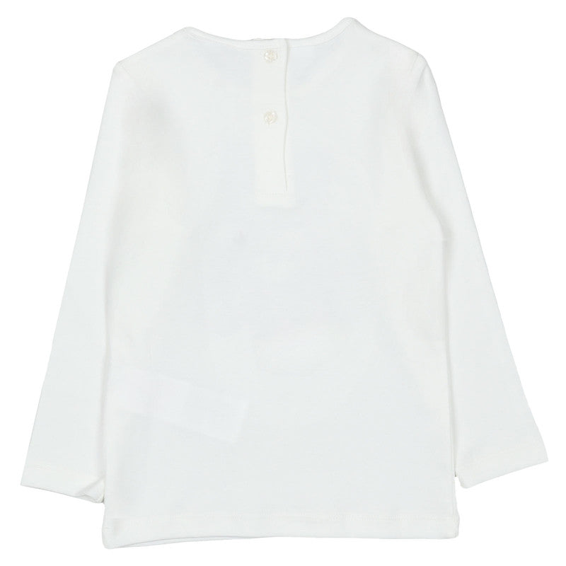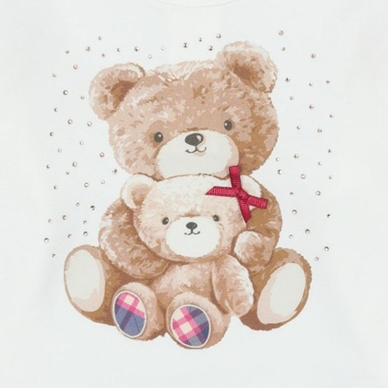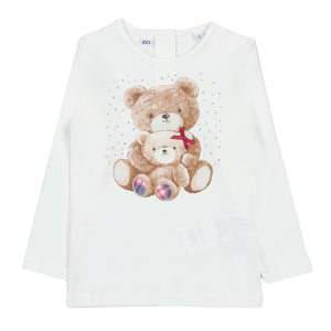 This soft, ivory long-sleeve top features an adorable graphic of two cuddling teddy bears with subtle rhinestone accents. It's a comfortable and charming piece, perfect for everyday wear and layering.