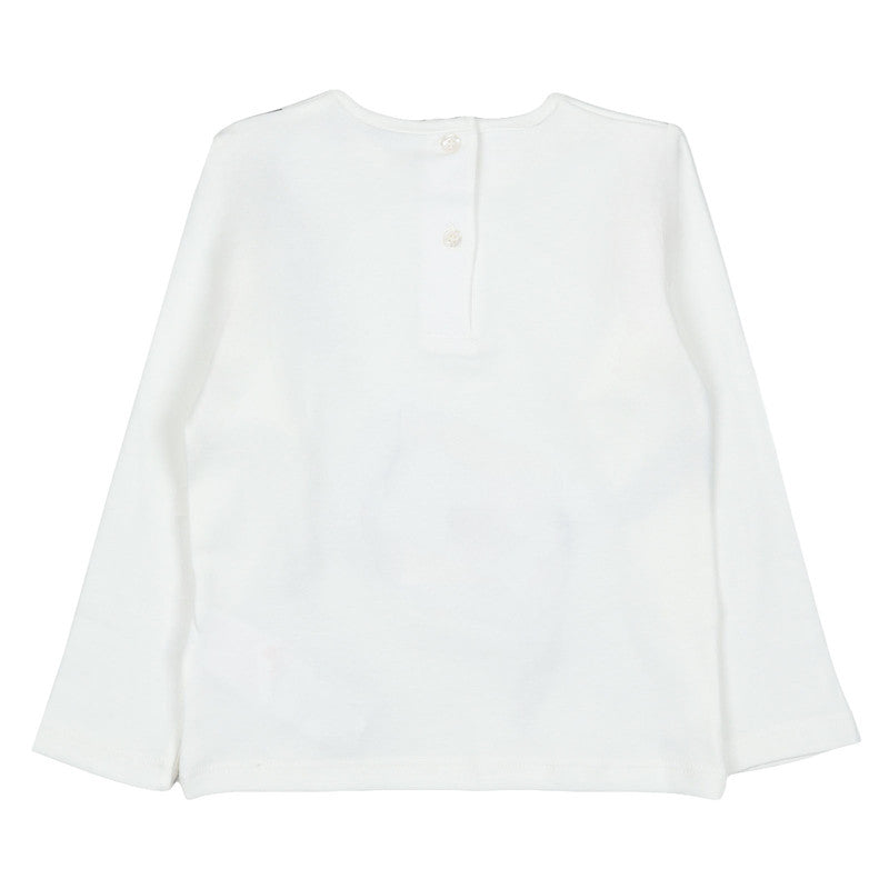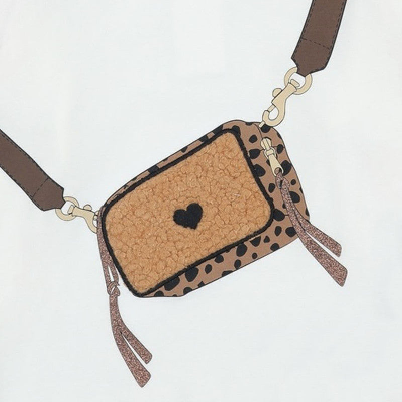 Off-white long-sleeved top by iDO, made in soft, comfortable cotton jersey. This casual top has a charming leopard print bag design on the front with glitter tassel detailing. It fastens with buttons on the back for ease of dressing.