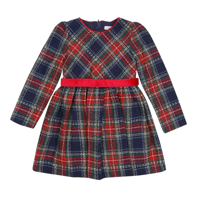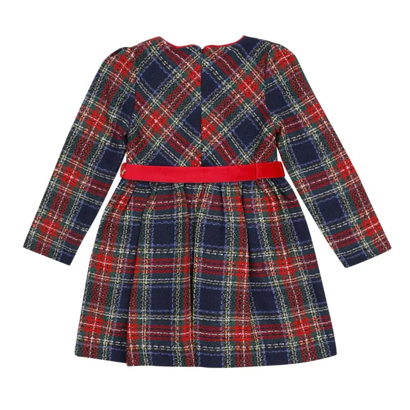 An elegant dress by Mayoral, in red and dark green tartan. With sparkling silver thread and red velvet details, this classic dress has long sleeves, a flared skirt for movement, and a hidden zip on the back. The lovely belt, detailed with a heart and logo, is removable and secures with buttons.