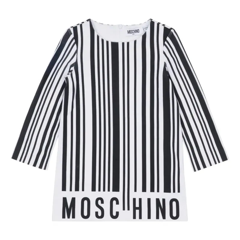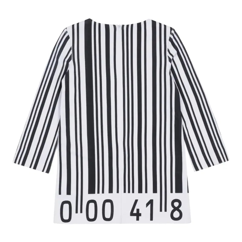 Moschino white round neck, long sleeves all over Barcode print & Logo print on the hem with back zip closure