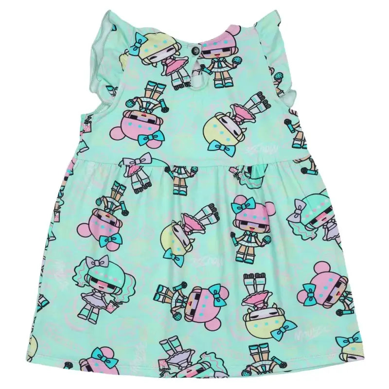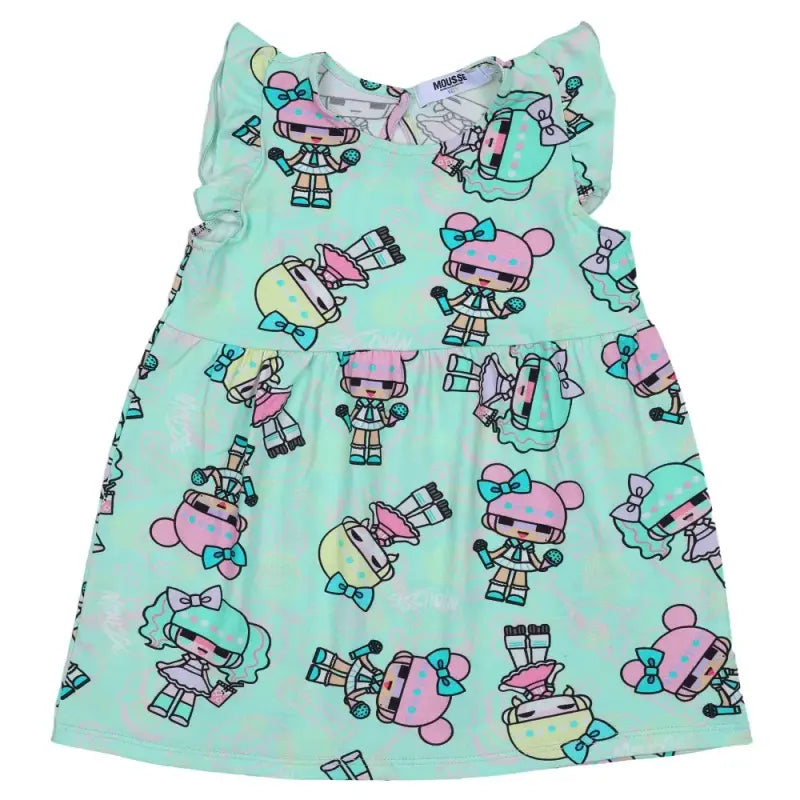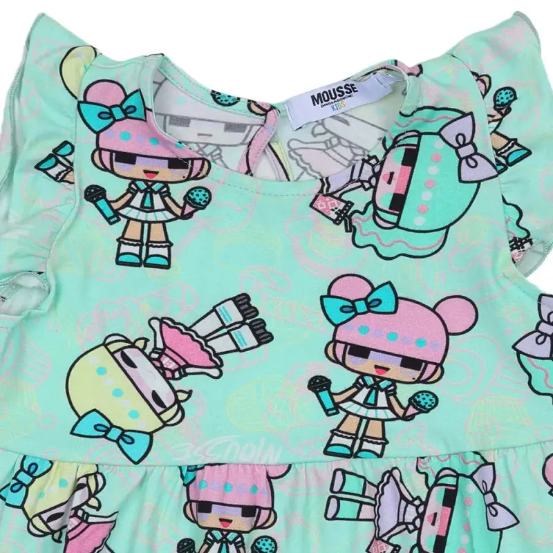 A light green Mousse kids dress with an all-over print featuring cartoon doll figures. The dress has short, ruffled sleeves and a gathered skirt. The print includes various poses and designs of the cartoon dolls, along with the "Mousse" logo visible at the top.